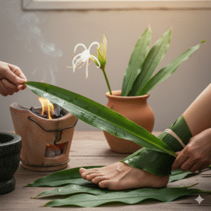 ข้อเท้าแพลง: การใช้ใบพลับพลึงลนไฟแล้วพันบริเวณที่แพลงจะช่วยรีดน้ำและลดการอักเสบของเส้นเอ็น