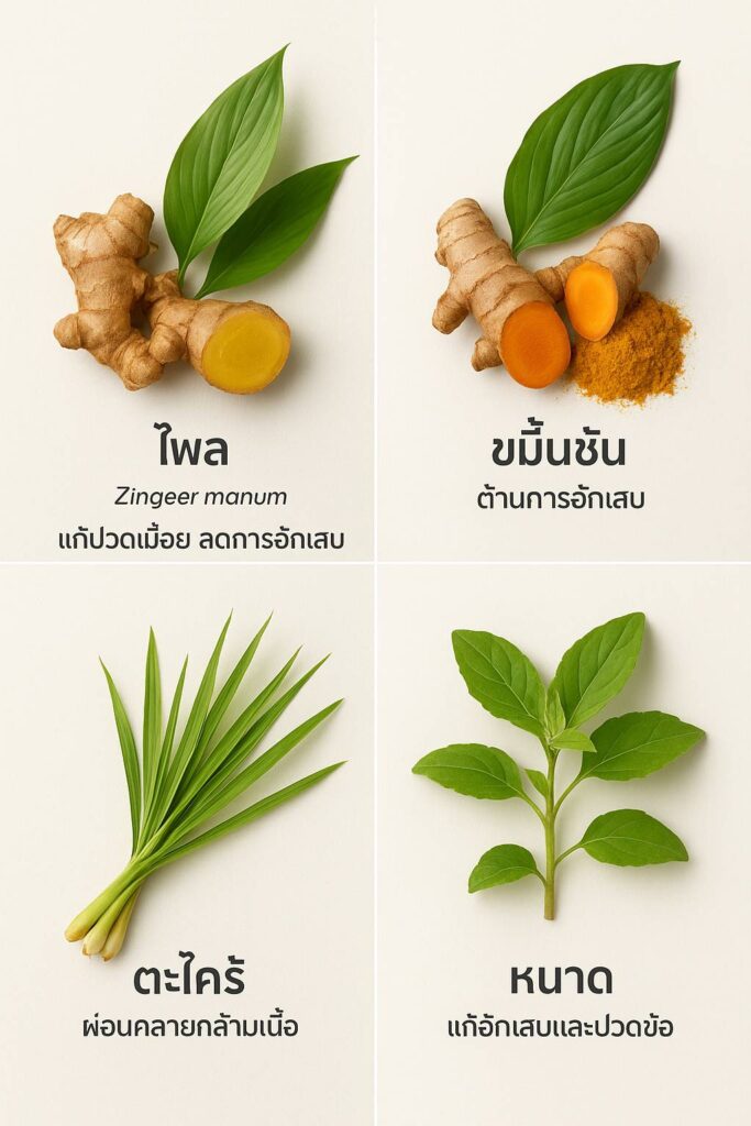 สมุนไพรหลายชนิดมีฤทธิ์ช่วยลดการอักเสบ คลายกล้ามเนื้อ และบรรเทาอาการปวดได้อย่างดี ได้แก่