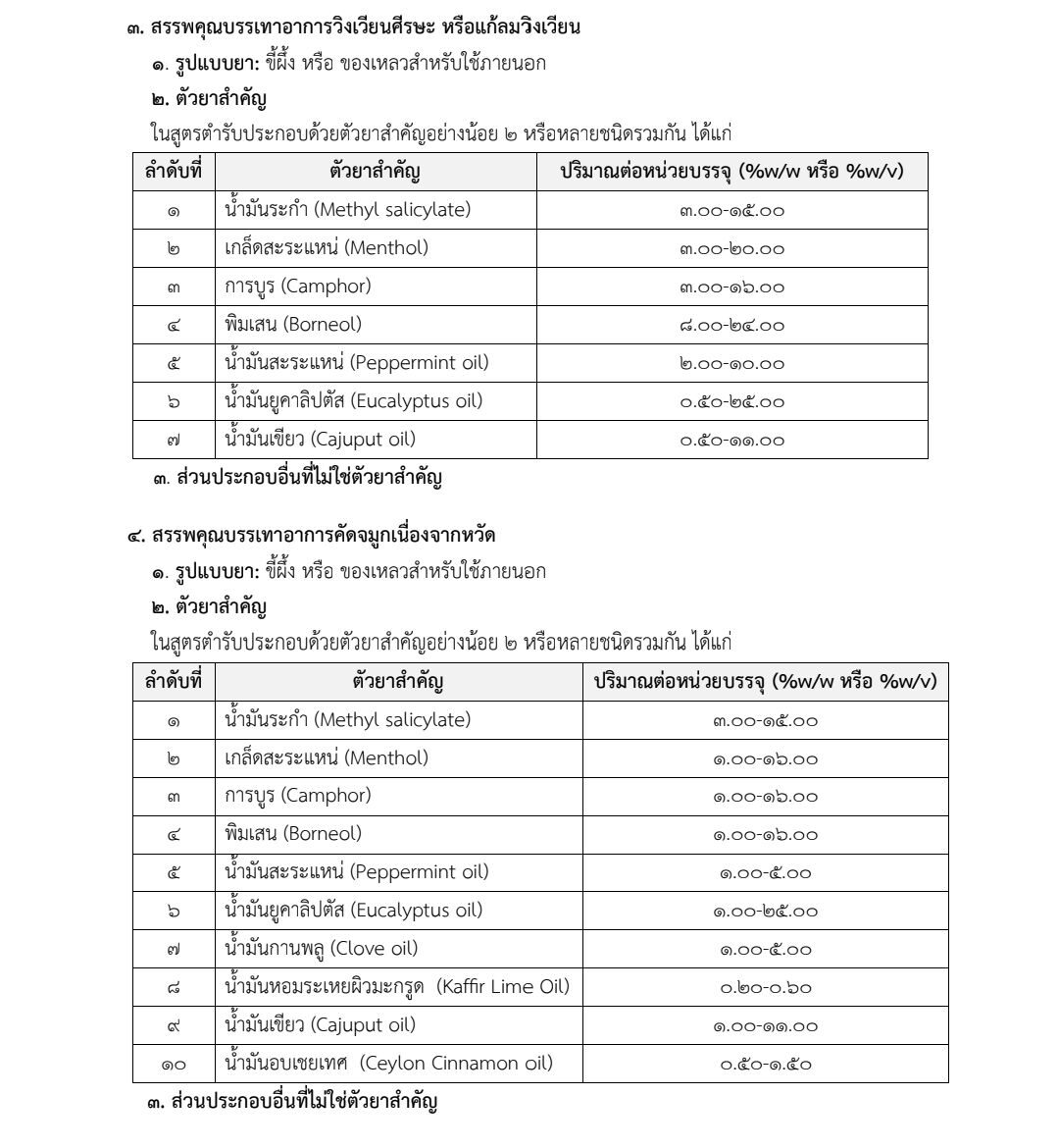 สูตรมาตรฐาน > บรรเทาอาการปวดเมื่อย แก้อาการจากแมลงสัตว์กัดต่อย บรรเทาอาการวิงเวียนศรีษะ หรือเมารถเมาเรือ และบรรเทาอาการคัดจมูกเนื่องจากหวัด
