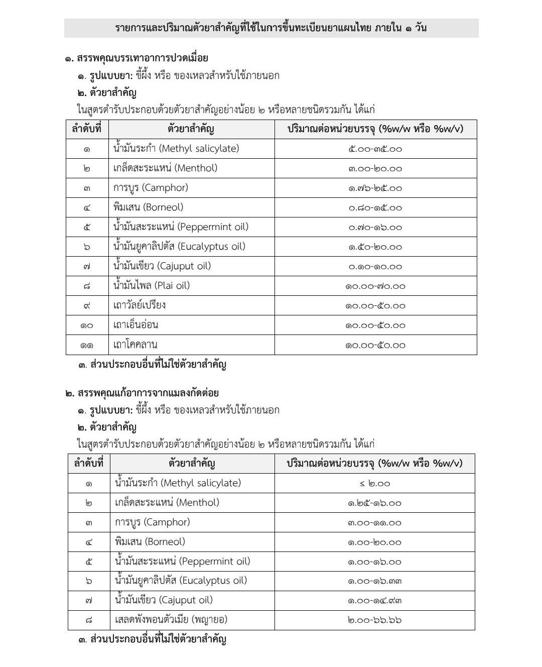 สูตรมาตรฐาน > บรรเทาอาการปวดเมื่อย แก้อาการจากแมลงสัตว์กัดต่อย บรรเทาอาการวิงเวียนศรีษะ หรือเมารถเมาเรือ และบรรเทาอาการคัดจมูกเนื่องจากหวัด