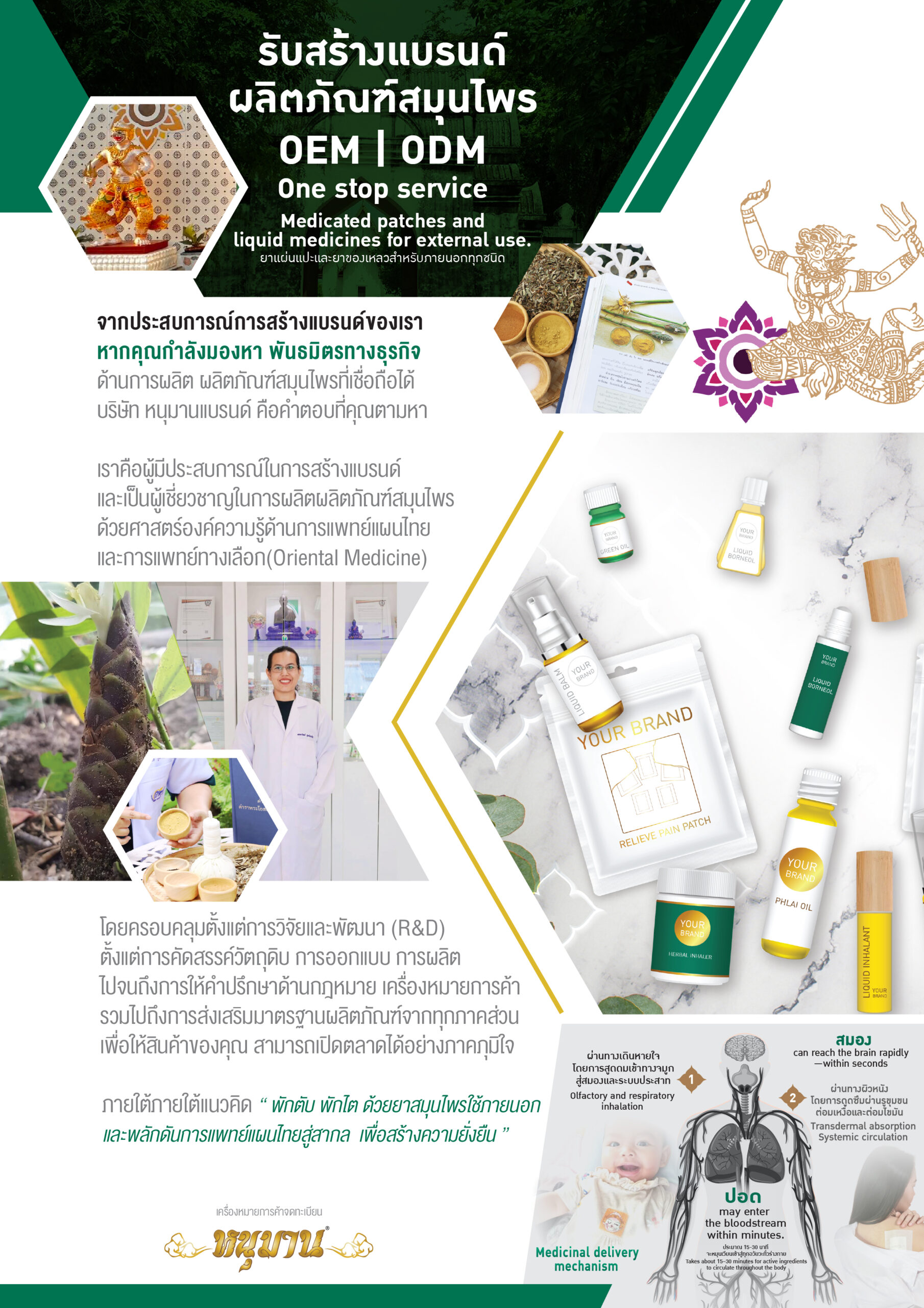 จากประสบการณ์การสร้างแบรนด์ของเรา หากคุณกำลังมองหาพันธมิตรทางธุรกิจด้านการผลิตผลิตภัณฑ์สมุนไพรที่เชื่อถือได้ บริษัท หนุมานแบรนด์ คือคำตอบที่คุณตามหา เราให้คำปรึกษาที่ครอบคลุมได้ตั้งแต่ การคัดสรรค์วัตถุดิบ การออกแบบ การผลิต การวิจัยและพัฒนา (R&D) ไปจนถึงการให้คำปรึกษาด้านกฎหมาย เครื่องหมายการค้า รวมไปถึงการส่งเสริมมาตรฐานผลิตภัณฑ์จากทุกภาคส่วน เพื่อให้สินค้าของคุณ สามารถเปิดตลาดได้อย่างมั่นใจ